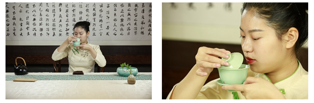 右手在闻香后将杯盖前沿下压,后沿翘起,然后在开缝中饮茶,小口喝入茶汤。