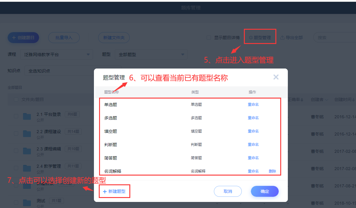 如果有一些题型名称是课程专属的,非通用的,可以选择题型管理中自定义题型名称和选择对应类型,注意自定义题型的题目不支持批量导入,只能在线选择添加,或按照题目所属的性质导入之后再批量修改,修改方式参考3.2视频。