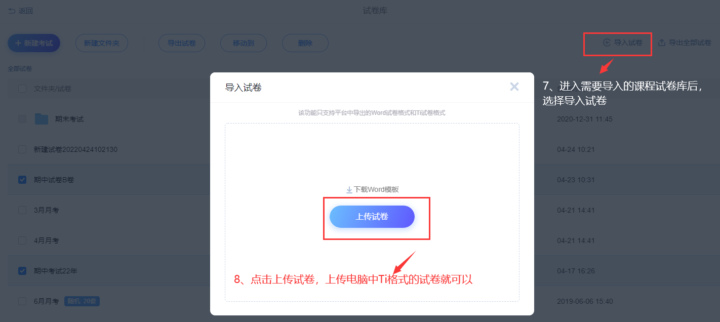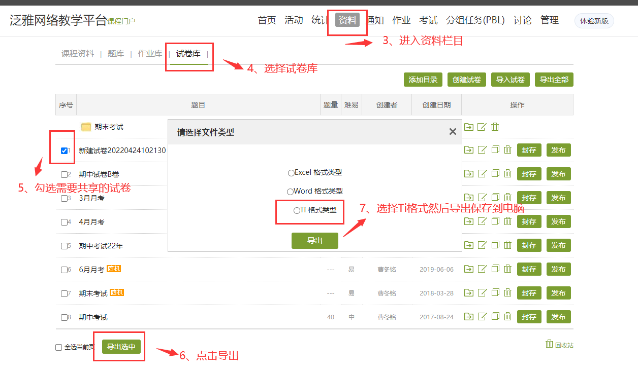 不同课程之间、不同老师之间可以通过导出ti格式的试卷,快速进行共享和考试的应用。