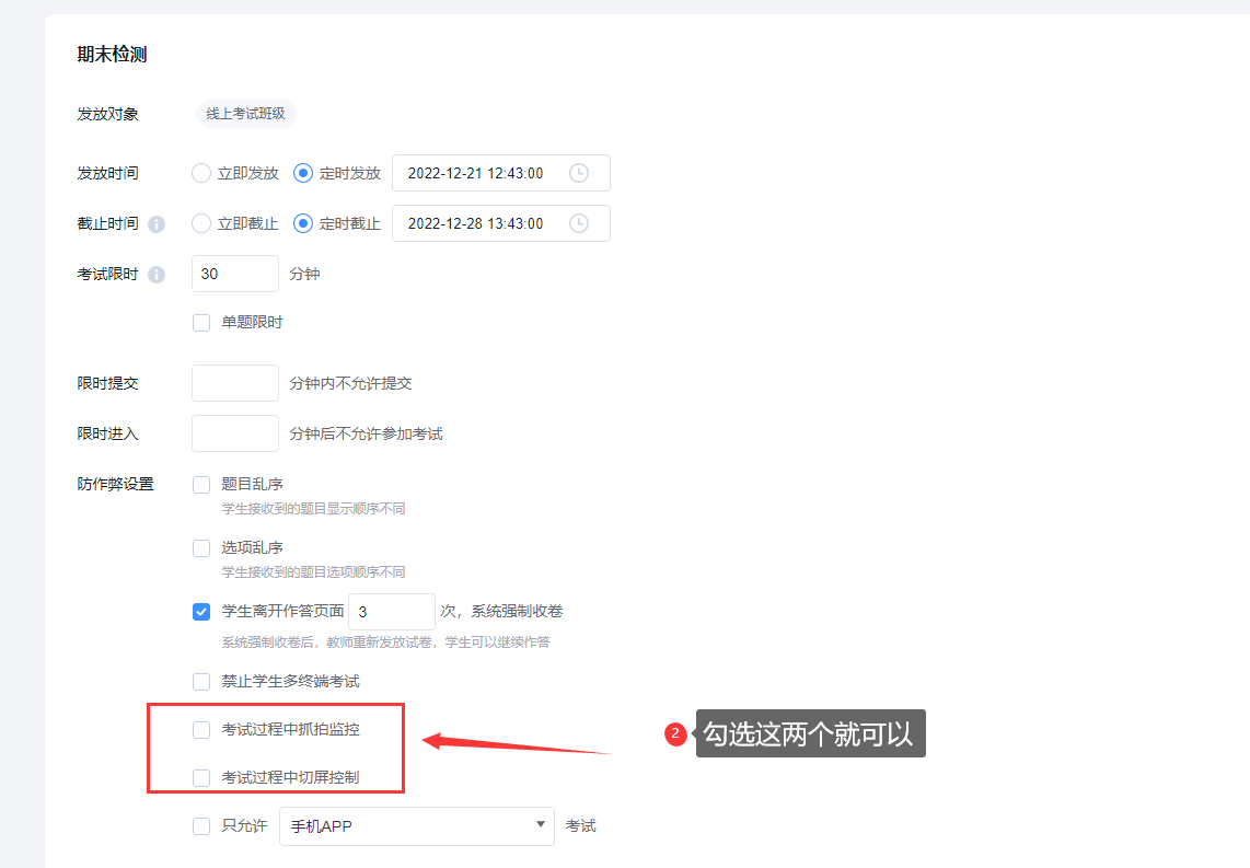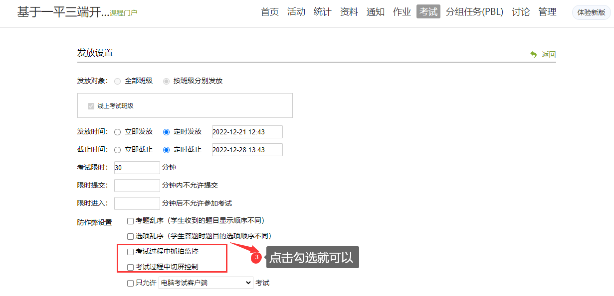 监考界面空白是因为在发布过程中未设置相关防作弊的设置,重新进去修改即可
