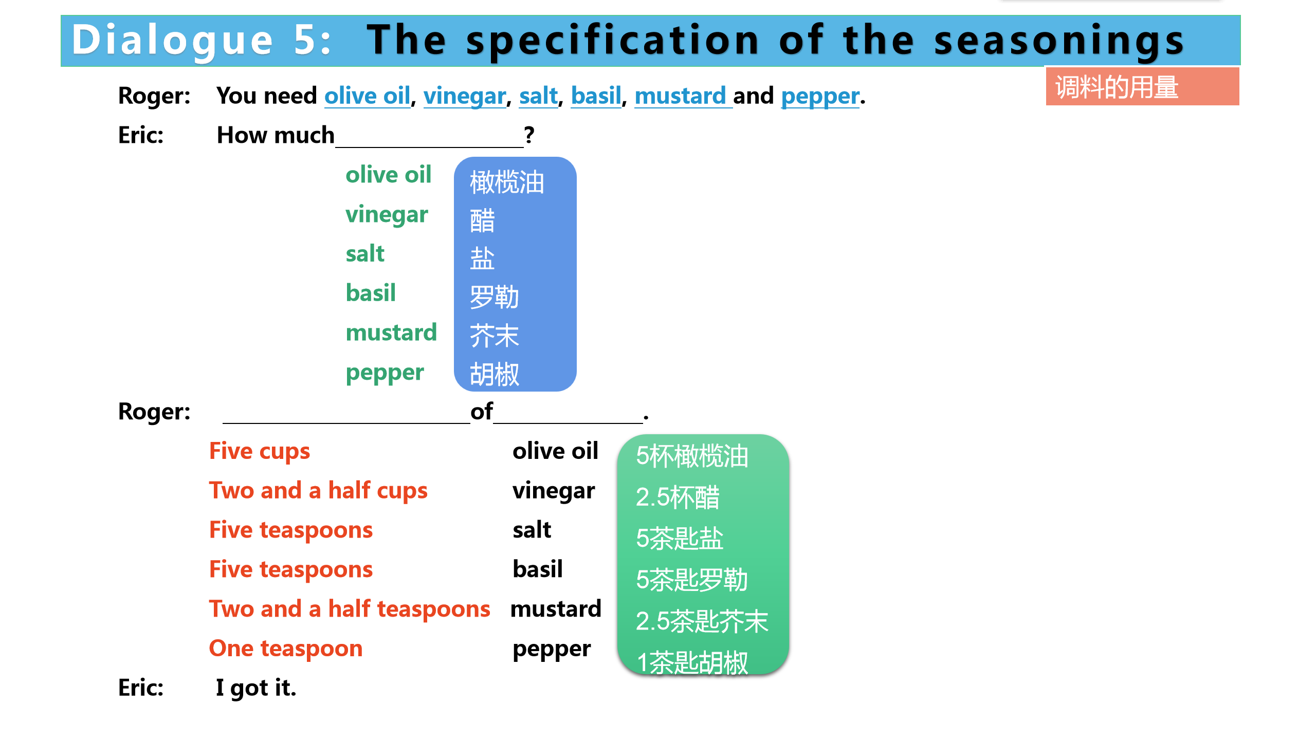 D5:调料的用量Dialogue 5:  The specification of the seasonings