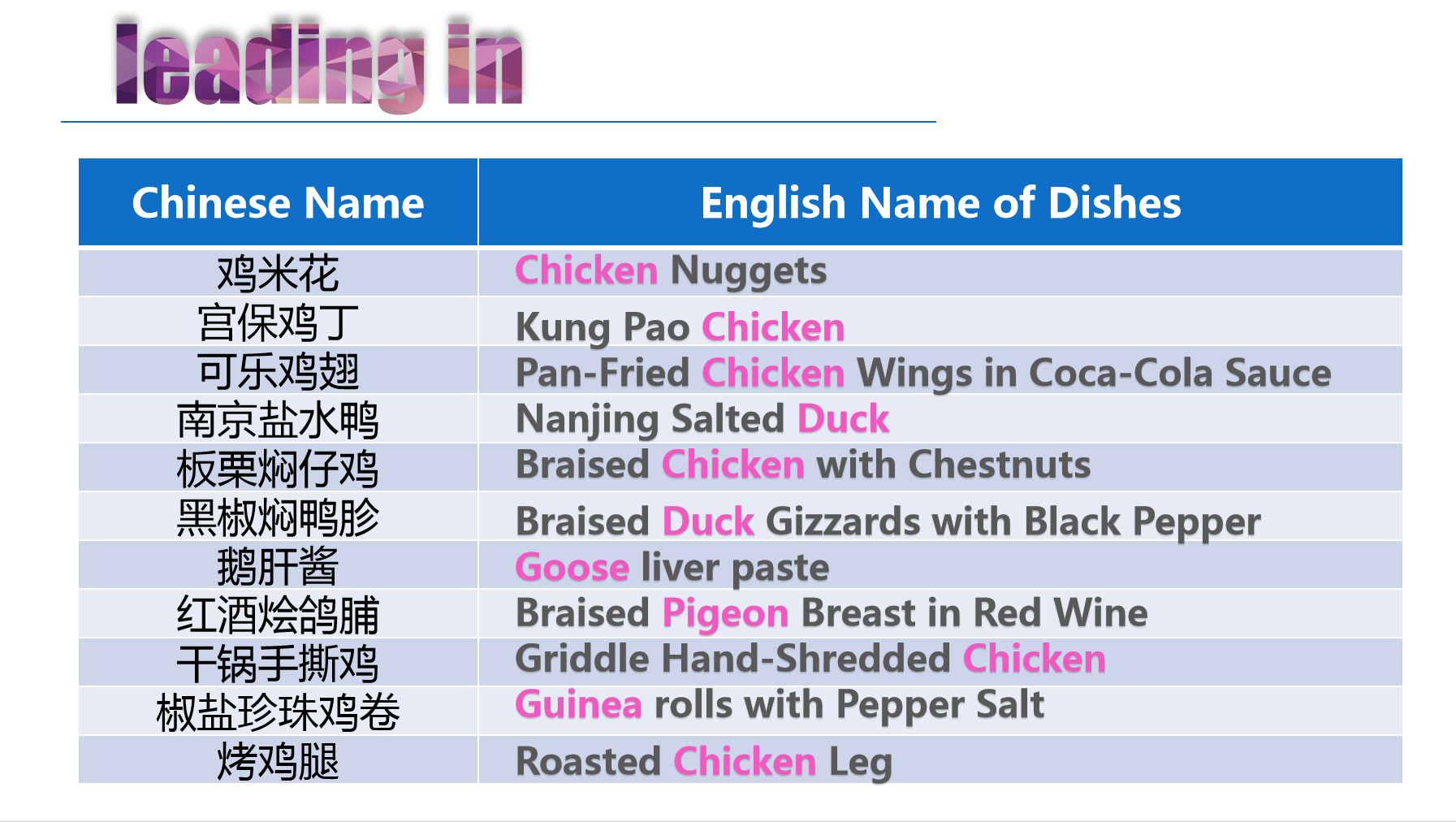 鸡肉 | chicken /ˈtʃɪkɪn/ | 鸭肉 | duck /dʌk/ |