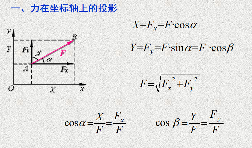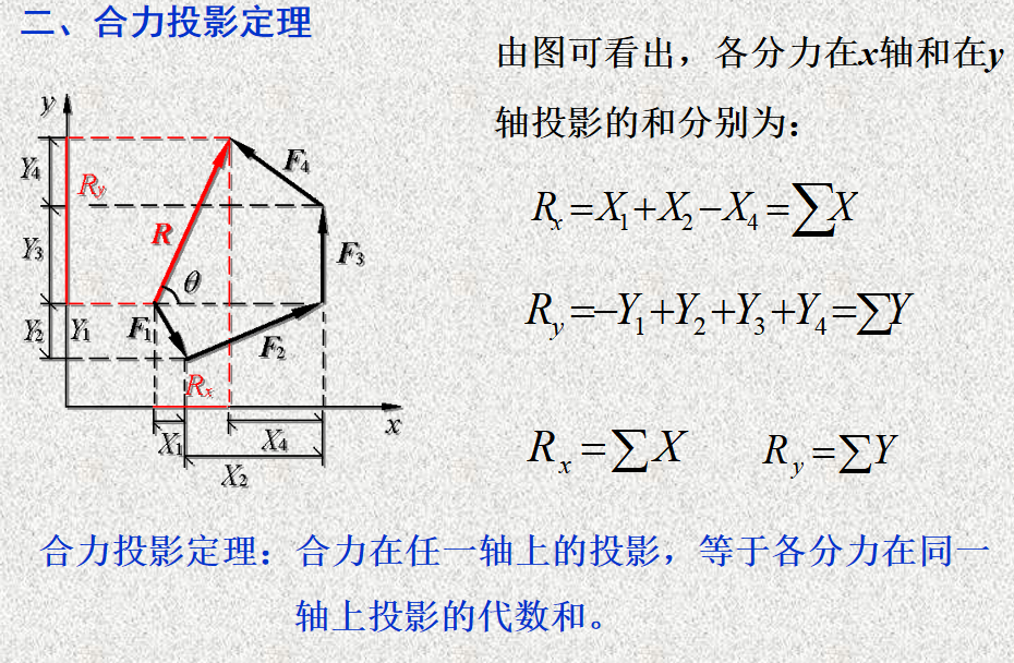 合力在任一轴上的投影,等于各分力在同一轴上的投影的代数和,这称为合力投影定理。
