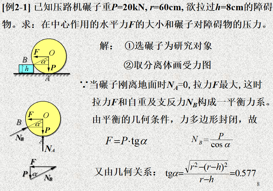 上式称为平面汇交力系的平衡方程,两个方程求两个未知量。