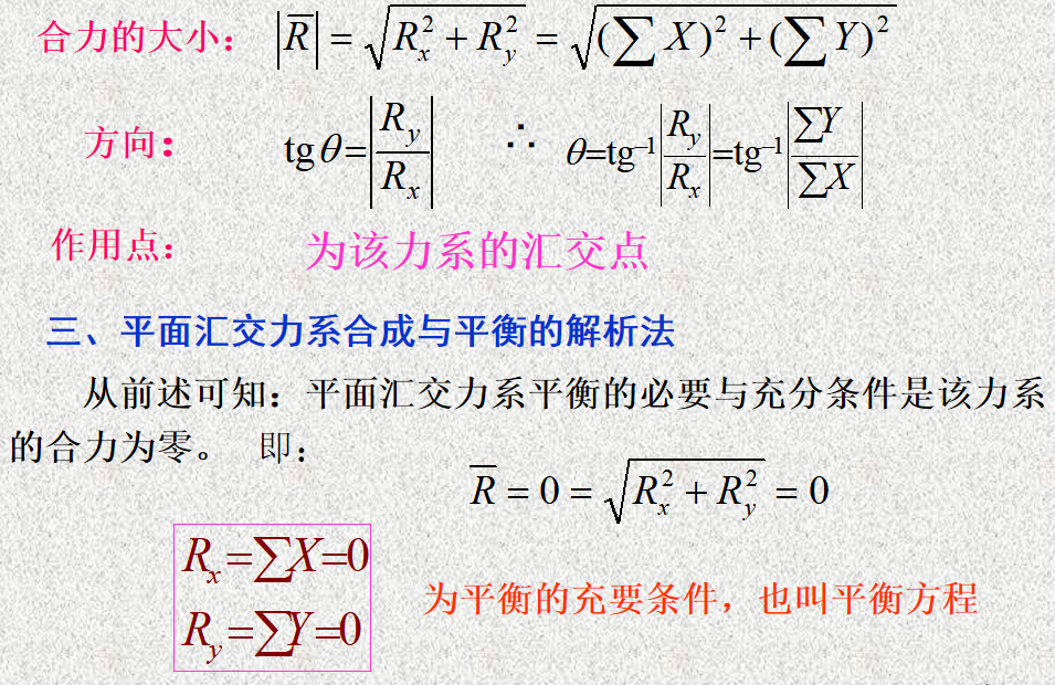 平面汇交力系平衡的必要与充分的解析条件是:力系中各力在直角坐标系中每一轴上的投影的代数和都等于零。