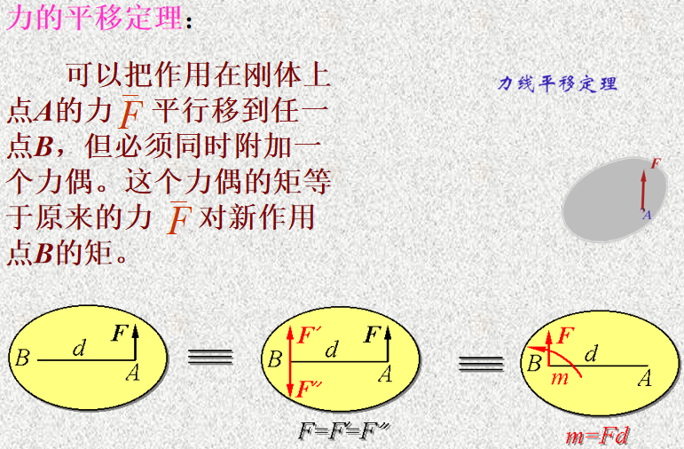 可以把作用在刚体上点O′的力平移到任一点O,但必须同时附加一个力偶,这个附加力偶的力偶矩等于原力对新作用点O的力矩。