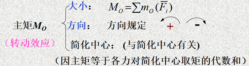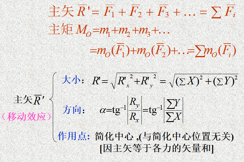 结论:平面力系向作用面内任一点简化,一般可得到一个力和一个力偶,该力通过简化中心,其大小和方向等于力系的主矢,主矢的大小和方向与简化中心无关;该力偶的力偶矩等于力系对简化中心的主矩,主矩的大小和转向与简化中心相关。