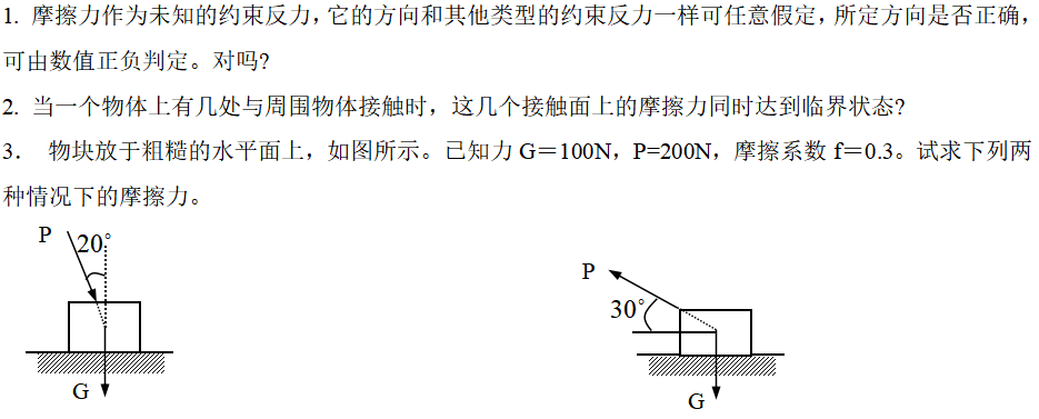 2 重点难点 | 重点:滑动摩擦力和滑动摩擦定律;考虑摩擦力时物体的平衡问题;平衡的临界状态和平衡范围。 难点:用摩擦角求解物体、物体系的平衡问题;考虑摩擦力时物体的平衡问题。 | |