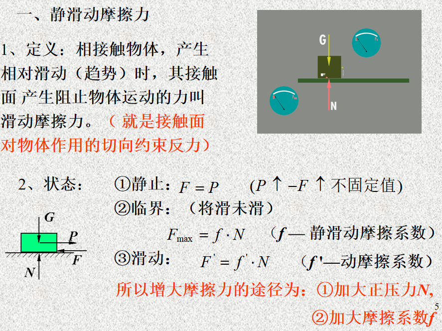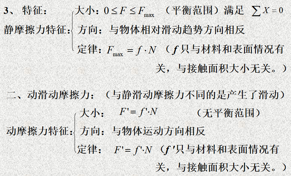 1.概念:两个相互接触的物体,当接触面之见有相对滑动或相对滑动趋势时,彼此阻碍滑动的机械作用。