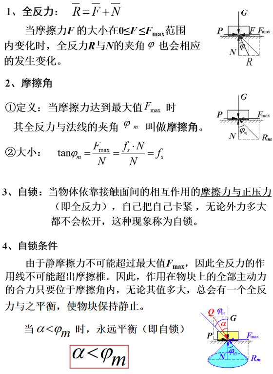 如果作用在物体上的全部主动力的合力的作用线在摩擦锥之内,则无论这个力怎么大,物体总能保持平衡,这种现象称为摩擦自锁。反之,如果全部主动力的合力的作用线在摩擦锥外,无论这个力怎么小,物体一定不能平衡。