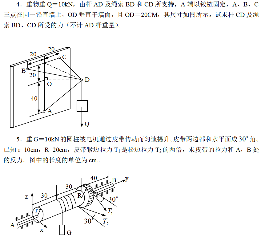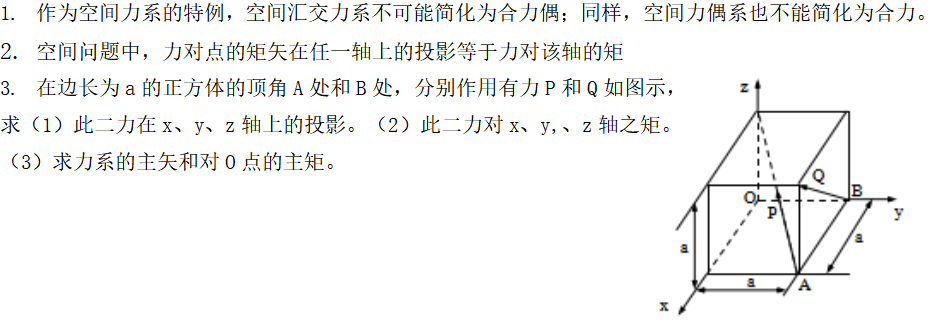 2 重点难点 | 重点:力在空间直角坐标轴上的投影;空间汇交力系的平衡方程的应用;力对轴的矩;空间力偶系的平衡方程的应用;空间一般力系平衡方程的应用;各种常见的空间约束及约束反力;重心的坐标公式。 | ||