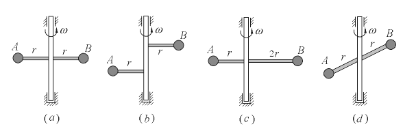 [例1] 质量不计的刚轴以角速度w匀速转动,其上固结着两个质量均为m的小球A和B。指出在图示各种情况下,哪些是静平衡的?哪些是动平衡的?