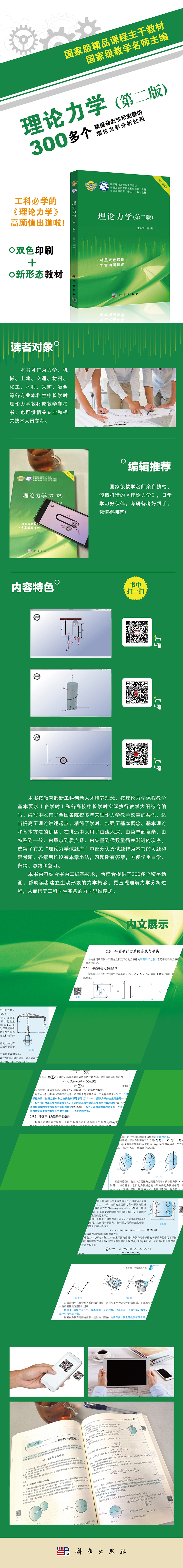 高质量新形态全生态。在主编王永岩1998年出版的《理论力学》基础上,融入历年教改成果和理念而成,至2007年第一版出版前,已有10年的使用,收集了大量的修订意见和新版素材,成书即被科学出版社确定为国家精品课程主干教材。2019年第二版出版前,编写团队进行了系统的梳理和校订,针对教材中的插图,全部制作了动画,在纸质教材中嵌入二维码,借助互联网“使平面的图形和公式动起来”。同时,历年国家精品课和精品资源共享课建设过程中形成的一系列优质教学资源也向所有使用者开放,如课程网站、答疑系统、全程录像、课件、教案、习题册、实验指导书、试卷、试题库、双语电子教程等,形成了线上线下结合的新形态全生态教学资源。