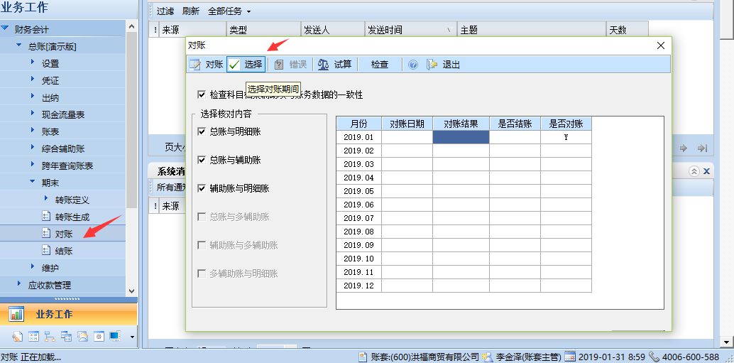 (1)依次点击总账——期末——对账;