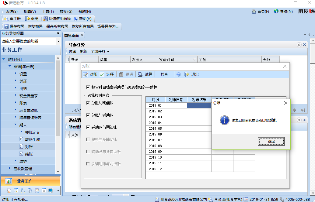 (2)在弹出的窗口中,直接按Ctrl+H组合键,弹出一个提示“恢复记账前状态功能已被激活”,再点击〖确定〗按钮;