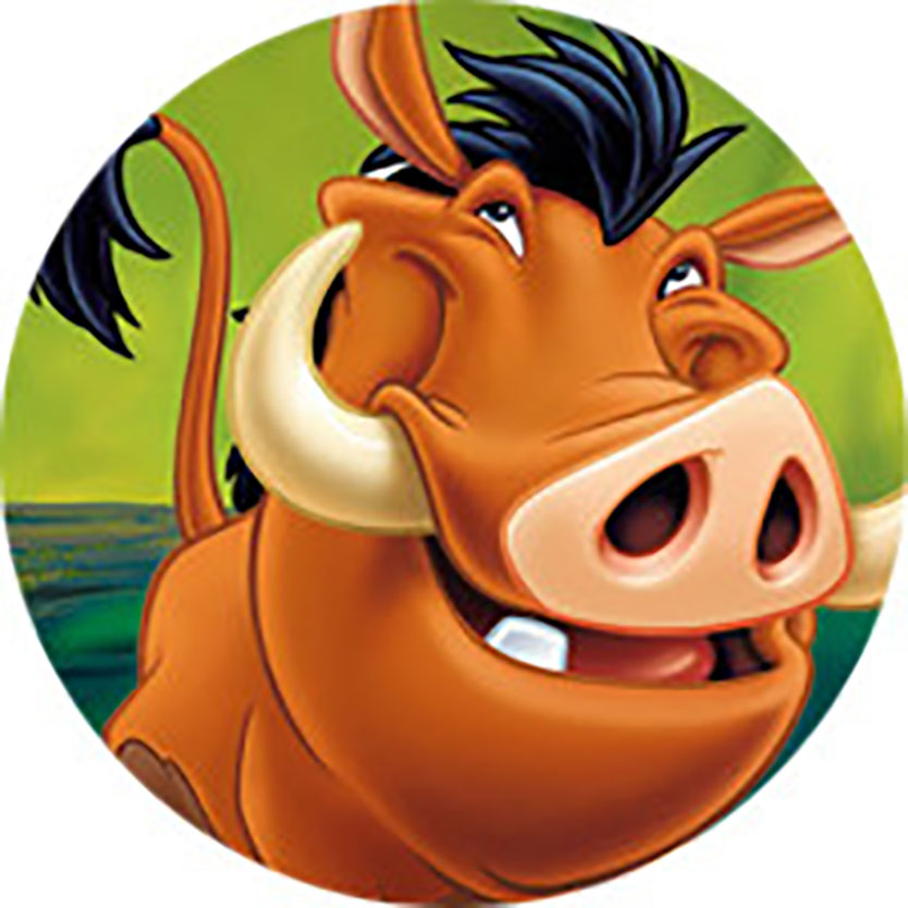 Pumbaa means"a bsentminded, careless" in Swahili. He's Timon's partner and a simple-minded African warthog.He has a generous heart and a warm personality, but he smells terrible.As a slow thinker, he thought even a predator like Simba could be his friend.He is also the first to show up when Simba is in need.He is a true friend.