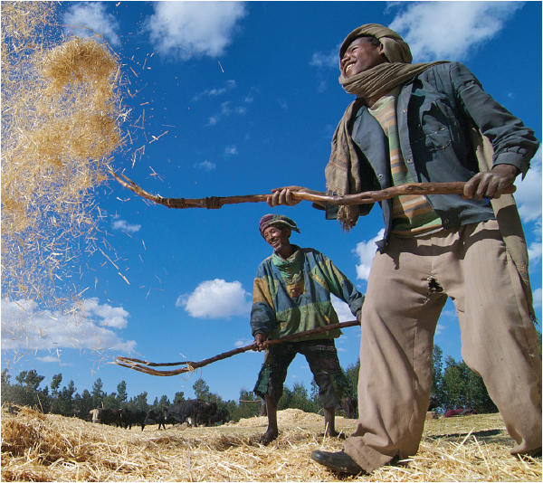 D. Farmers usually work outdoors. They need to know how to plant and grow food. These farmers in Ethiopia are harvesting wheat.