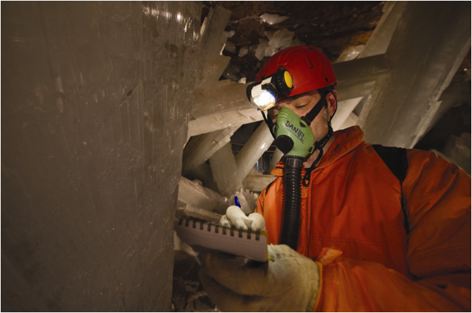 G. A National Geographic writer on assignment in the Cave of Crystals, Naica, Chihuahua, Mexico