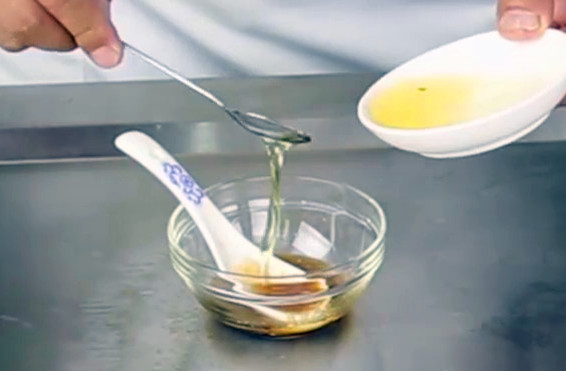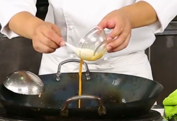 4.要求调味阶段越快越好。对汁调味无疑是最合适的,爆菜勾芡时,在泼汁入锅的同时一定要快速搅拌和颠翻。油锅爆熟材料之后,锅底的温度大大高于滑炒中滑熟原料之后的温度。动作一慢就可能导致芡粉结团,包裹不匀。