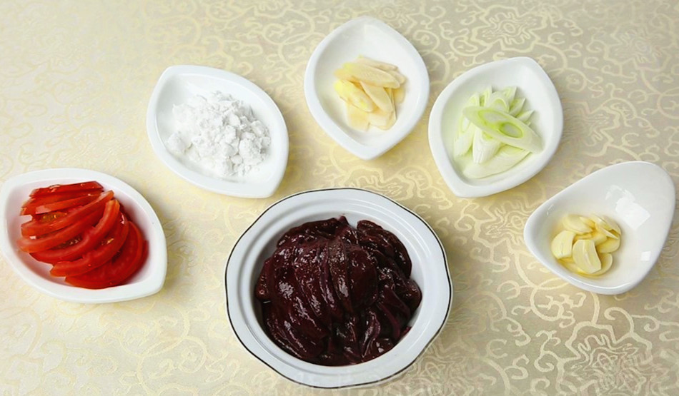 Guangxi cuisine "fried shredded chicken with leek", "fried frog with towel gourd", Guangdong cuisine "fried crispy bone" and "fried vegetable heart", Shandong cuisine "fried pig ear" (see figure 1-4-1), Jiangsu cuisine "fried butterfly slice", Sichuan cuisine "fried pig liver with fresh tomato", Hunan cuisine "fried screw pepper", chongqing cuisine "fried eel section", etc.