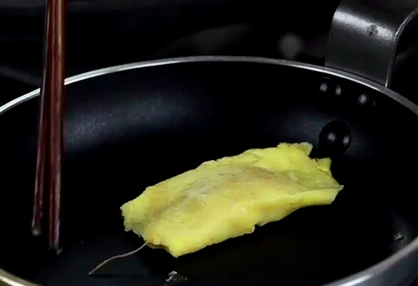 4. Fry one side first to make it into shape, and then turn it over to fry the other side to make both sides mature and consistent in color. Generally, it is golden yellow. When frying raw materials, keep shaking the frying pan to make the raw materials heated evenly.