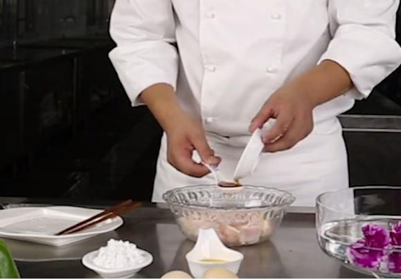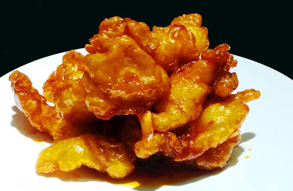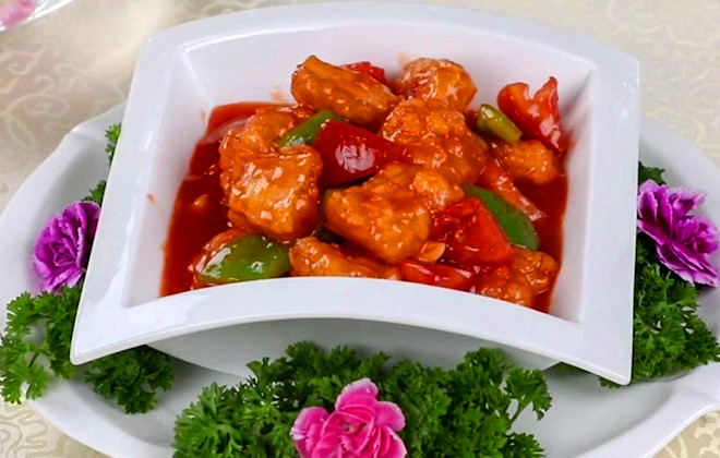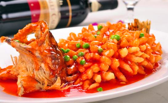 4.裹汁处理。尽量使复炸和制作酱汁同时进行或者尽量缩短两者之间的时间间隔,以保持热料、热卤状态,才能使酱汁渗入到原料内部,菜品才会入味。料热酱汁冷或料冷酱汁热,都不能达到脆熘菜的成菜效果。
