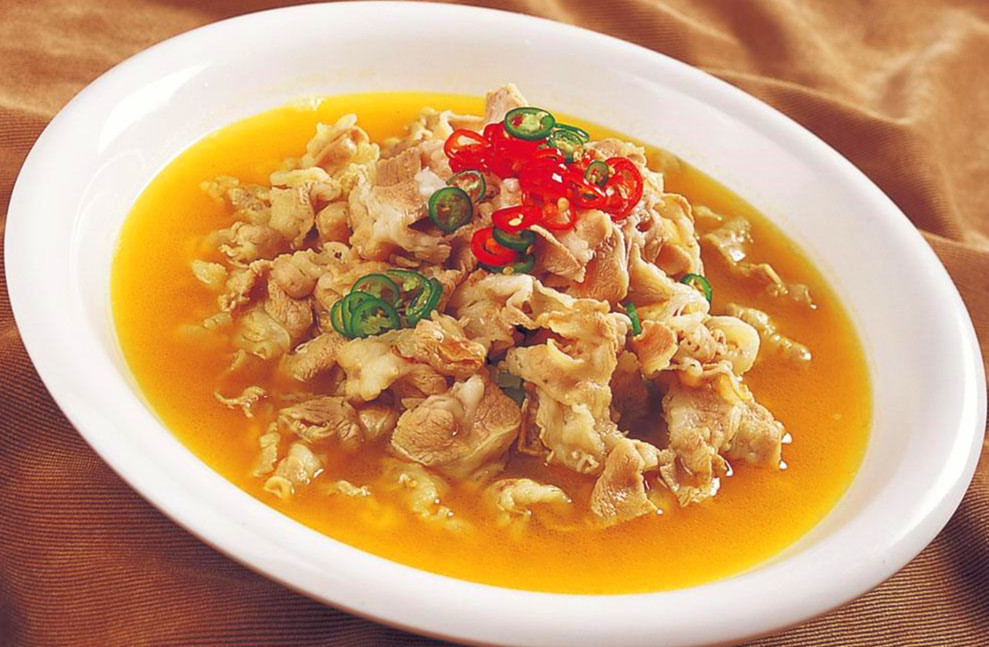 5. Stew in golden soup: color and flavor with pumpkin juice, which is often matched with soft and smooth raw materials. For example, fatty tofu in golden soup, fat beef in golden soup (see figure 3-4-2) and other dishes. It is characterized by golden color and strong aroma.