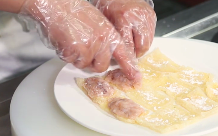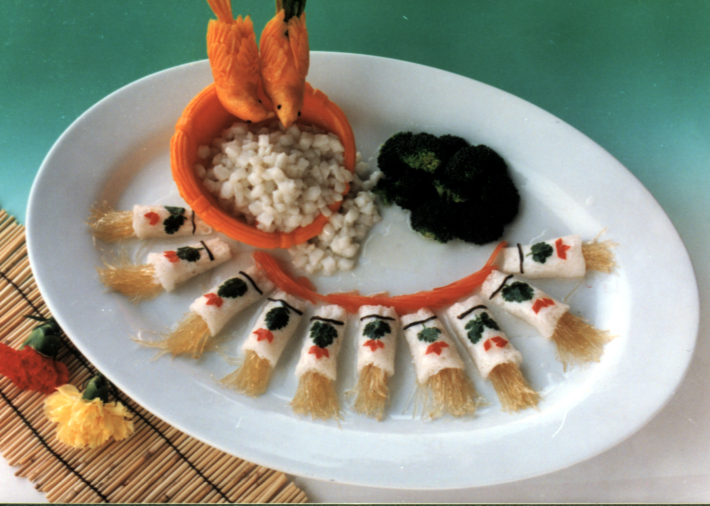 3.瓤制成形。将调制好味的辅料填瓤入预先制成的主料内或表面,即成瓤菜生坯。瓤制方法有“夹瓤”、“整只象形瓤”和“整段瓤”三种。