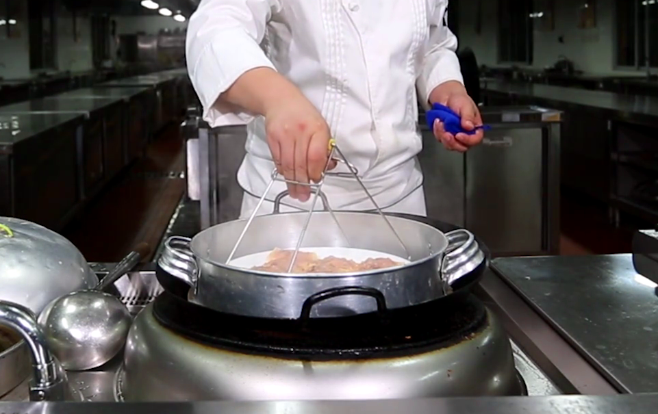 4. Steamed into vegetables. After the meat vegetable green body is prepared, different steam methods can be adopted according to the properties of the main material, such as "original steam" and "steam release" to steam and mature. After steaming, pour the prepared flavor juice.