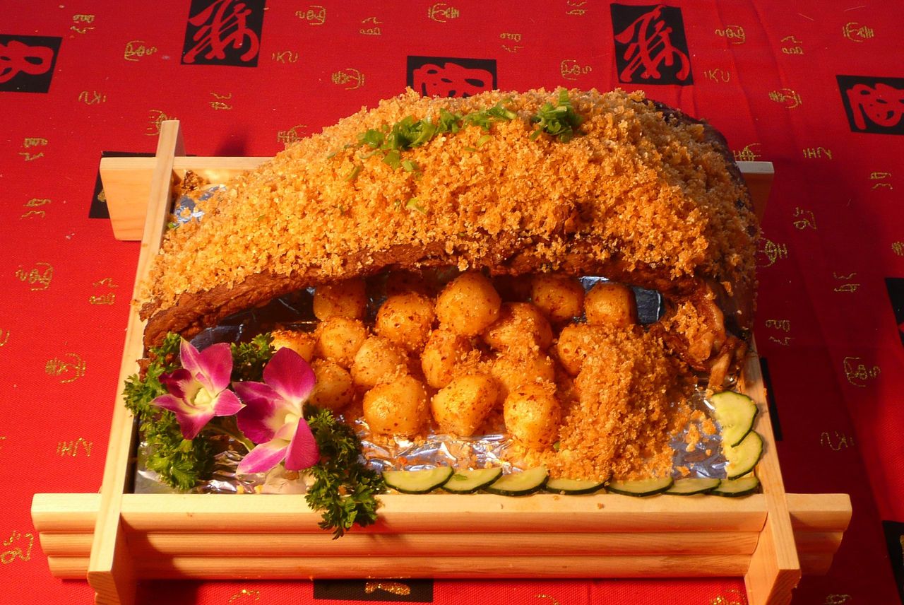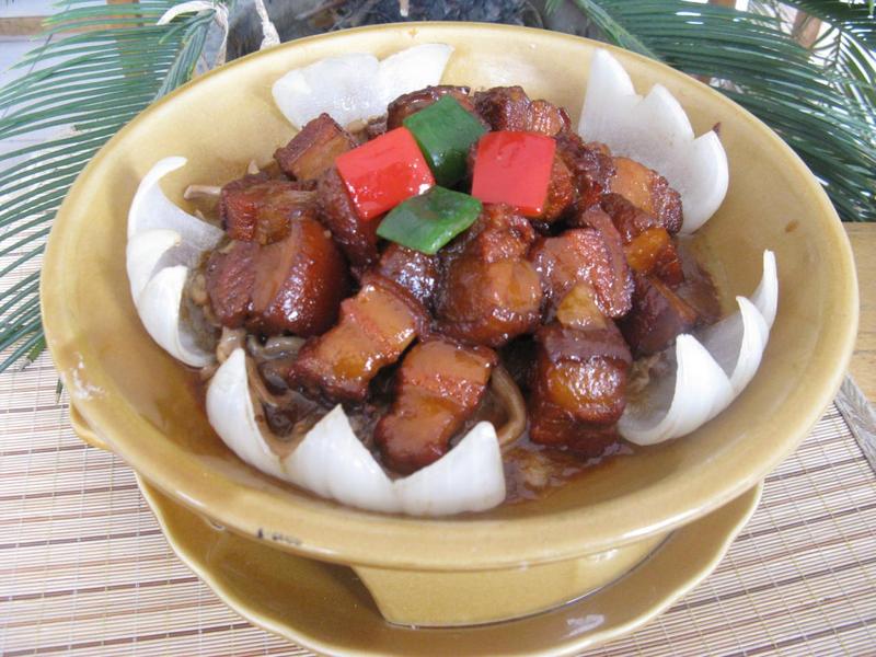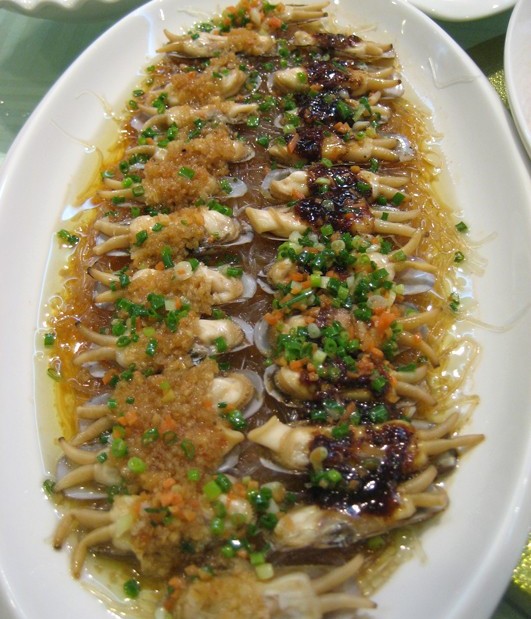 Guangxi cuisine "roasted mashed mutton in open oven", Xinjiang cuisine "roasted fat beef in open oven" and "roasted beef waist in open oven", Tibetan cuisine "roasted lamb chop with cumin" (see figure 5-1-1), Guangdong cuisine "roasted oyster with garlic" and "roasted hemp skin suckling pig", Fujian cuisine "roasted eggplant with garlic egg" (see figure 5-1-2), Zhejiang cuisine "roasted pig's feet", etc.