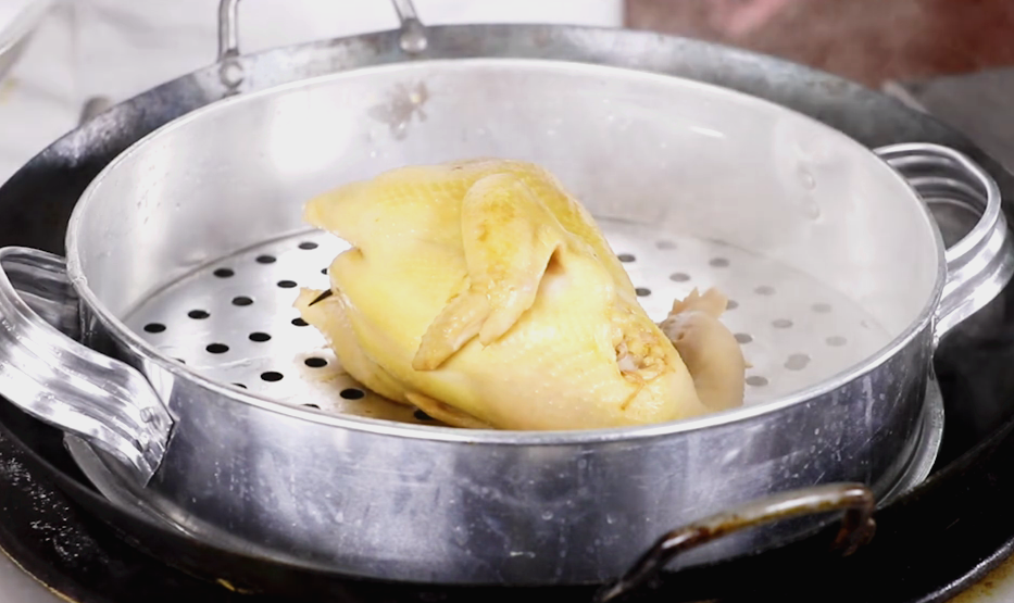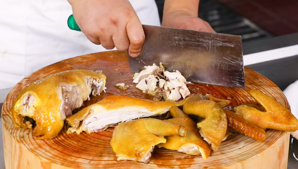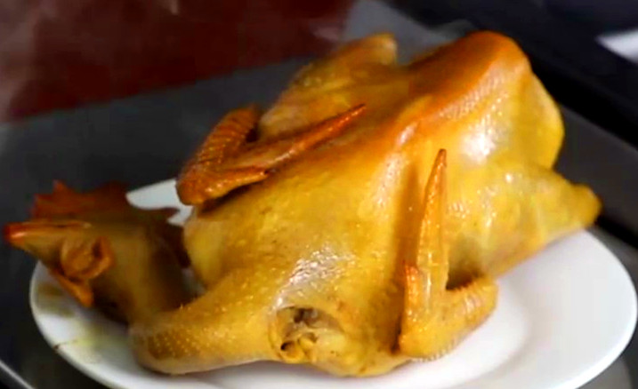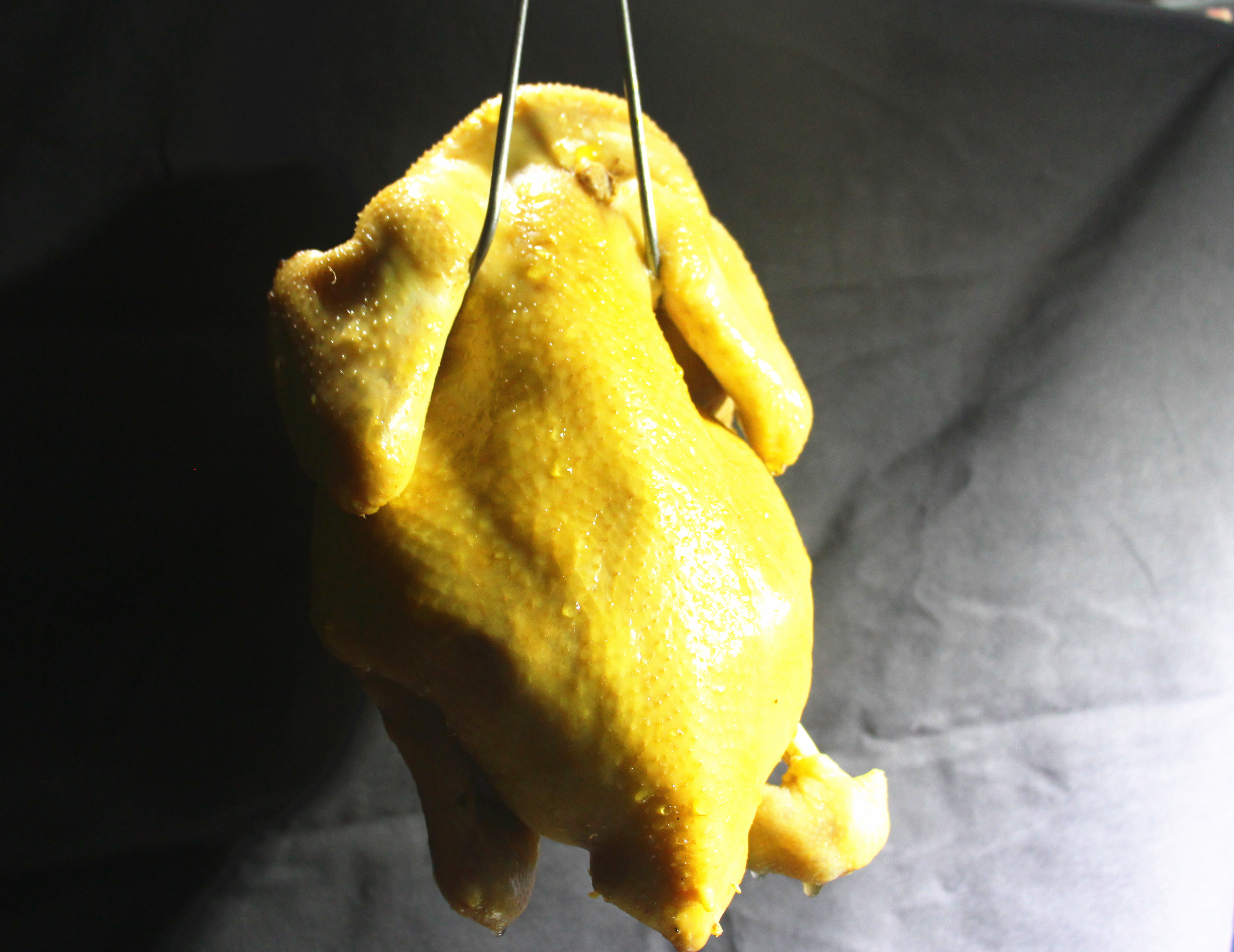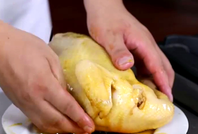 3.原料在熏制前一般都需要保持原状,以便熏制时受热均匀、色泽一致。如鸡、鸭、鸽经宰杀、去毛后,从下开一小口,掏出内脏,砍去脚爪即可。