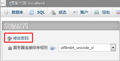 进入 phpMyAdmin 管理页面,单击修改密码。如下图所示: