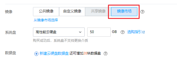 部分境外地域暂不支持通过镜像市场创建云服务器,若您选择的地域下没有镜像市场,请选择其他支持镜像市场的地域。