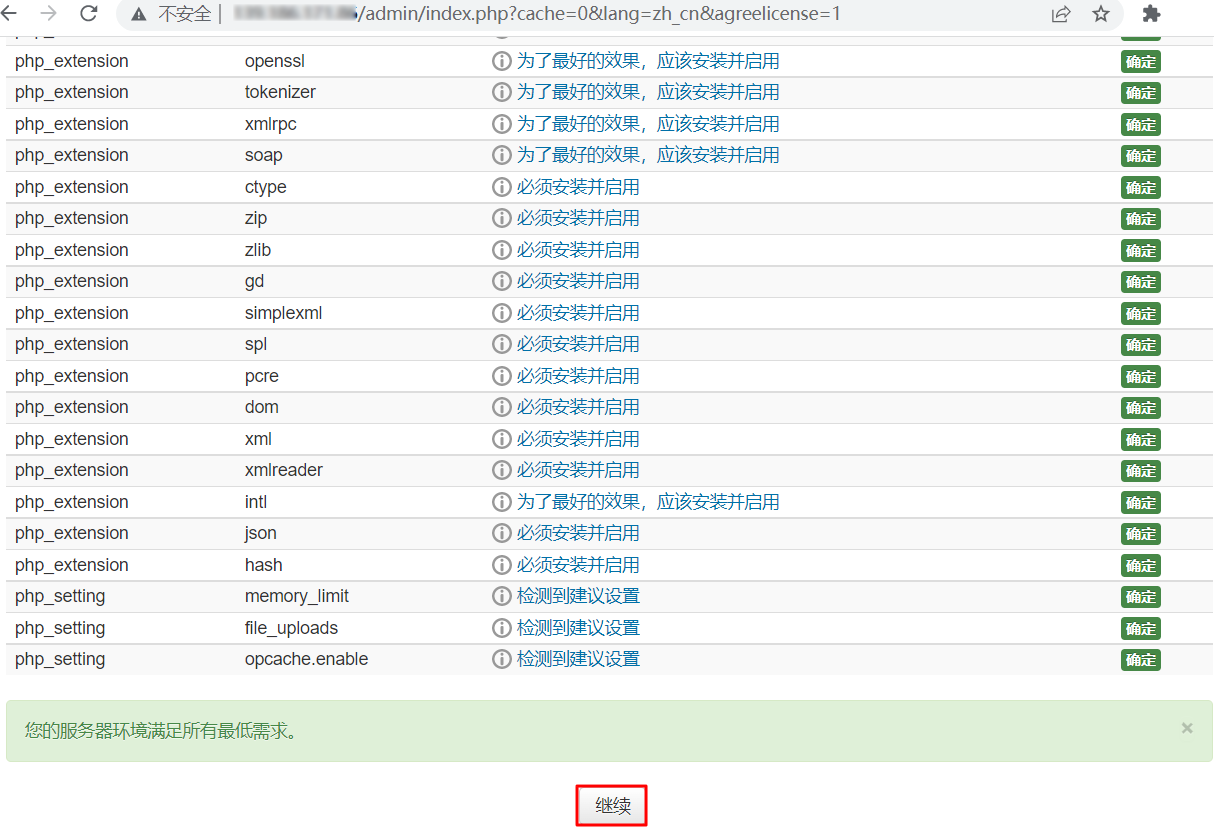 等待组件安装完成后,单击页面底部的继续。如下图所示: