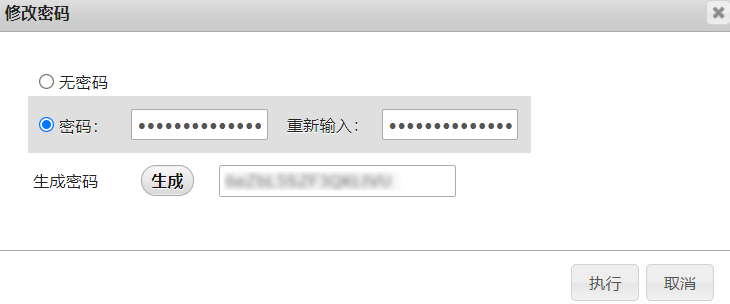 在弹出的“修改密码”窗口中,选择自行设置或自动生成密码,并单击执行。如下图所示: