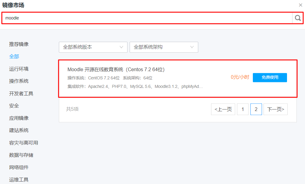 单击镜像名可查看镜像详情,本文使用 Moodle 开源在线教育系统(Centos 7.2 64位)。