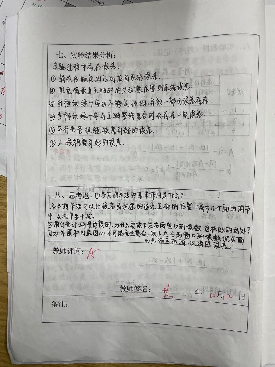 这时,望远镜的光轴与分光计中心轴垂直。此后,望远镜仰角调节螺丝不能再任意调节!
