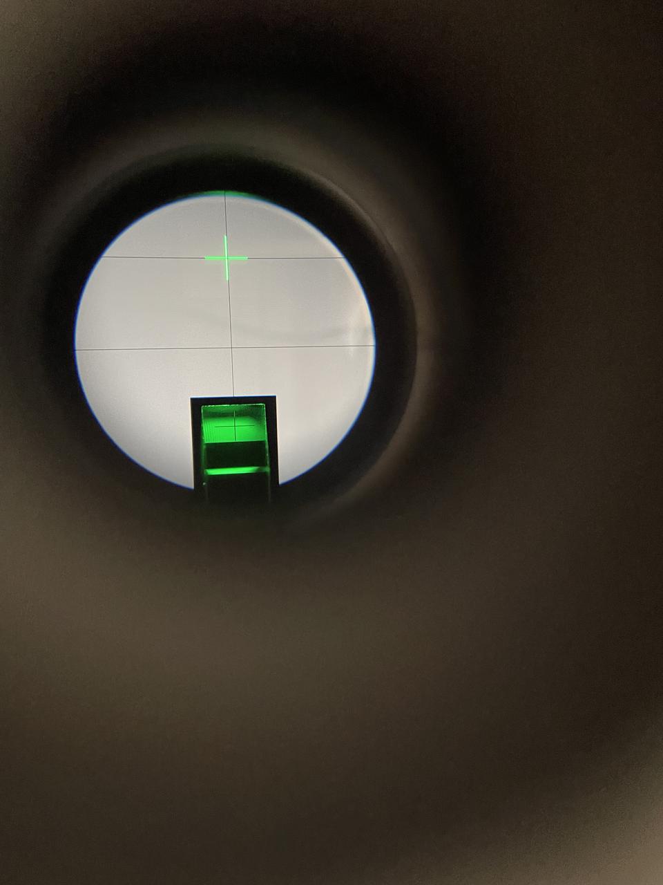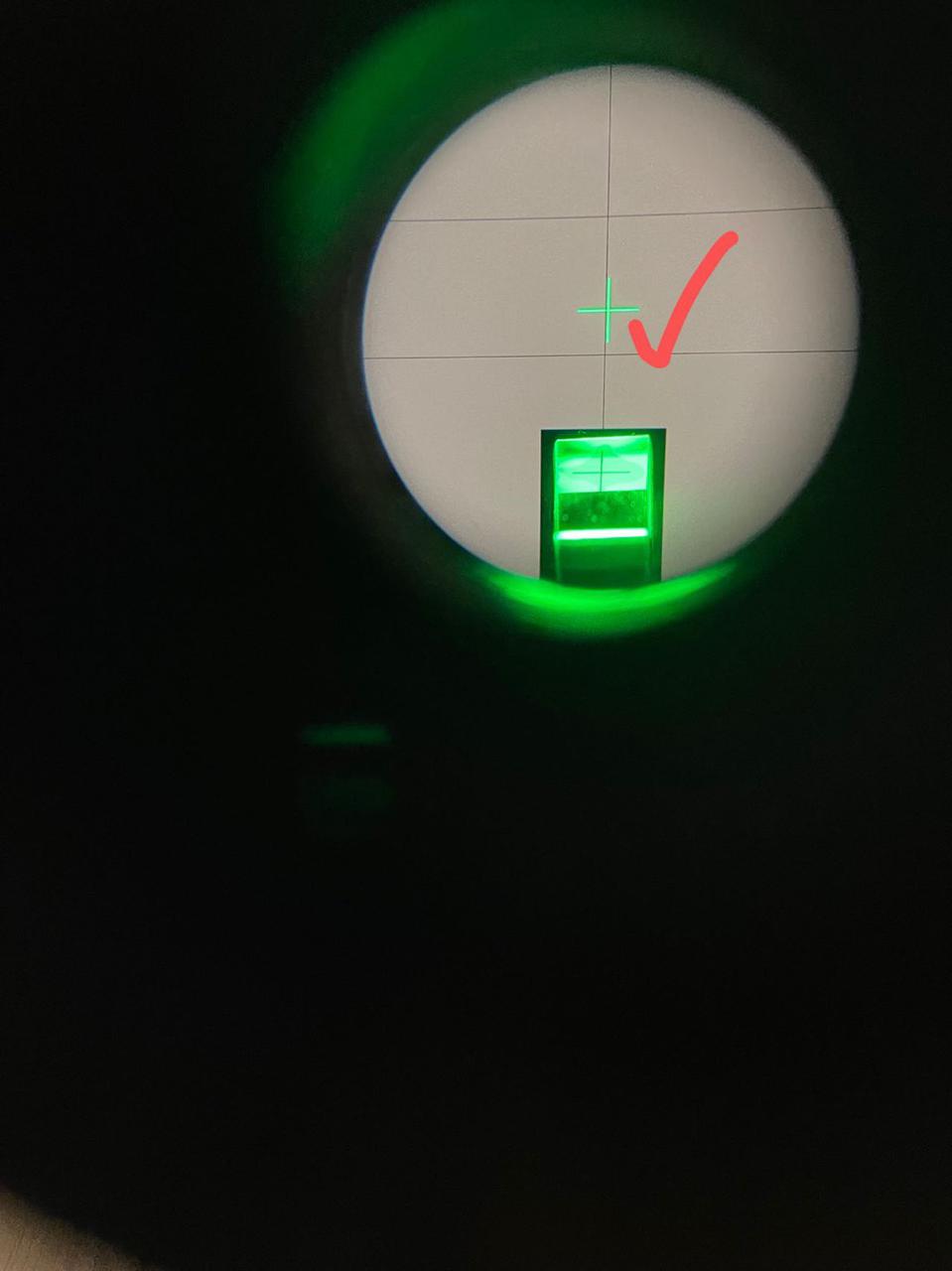 (4)重复上述步骤(3),反复调节,逐次逼近,即可较快达到调整要求。使双面反射镜两个面反射的绿十字像均与分划板上方的十字刻度线的水平线重合。