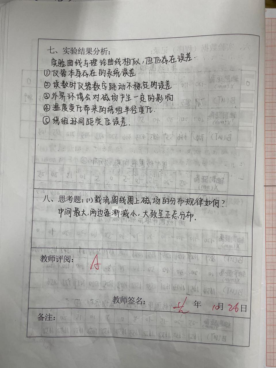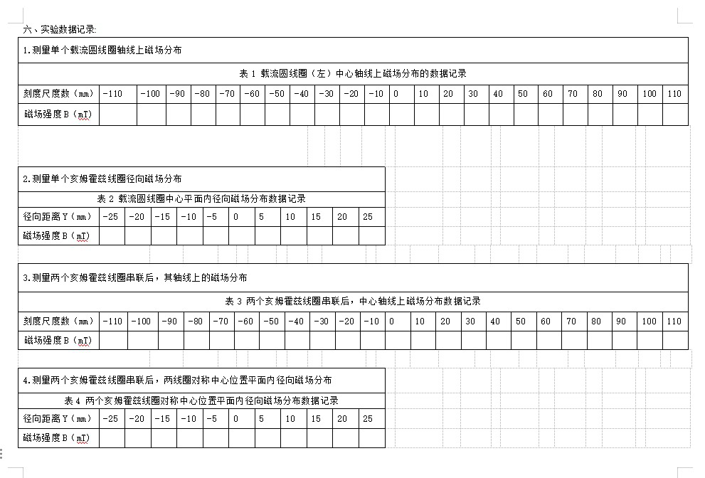 (3)使励磁电流I=0.400A,以圆电流线圈中心为坐标原点,每隔1.0cm测一个B值,测量过程中注意保持励磁电流值不变;