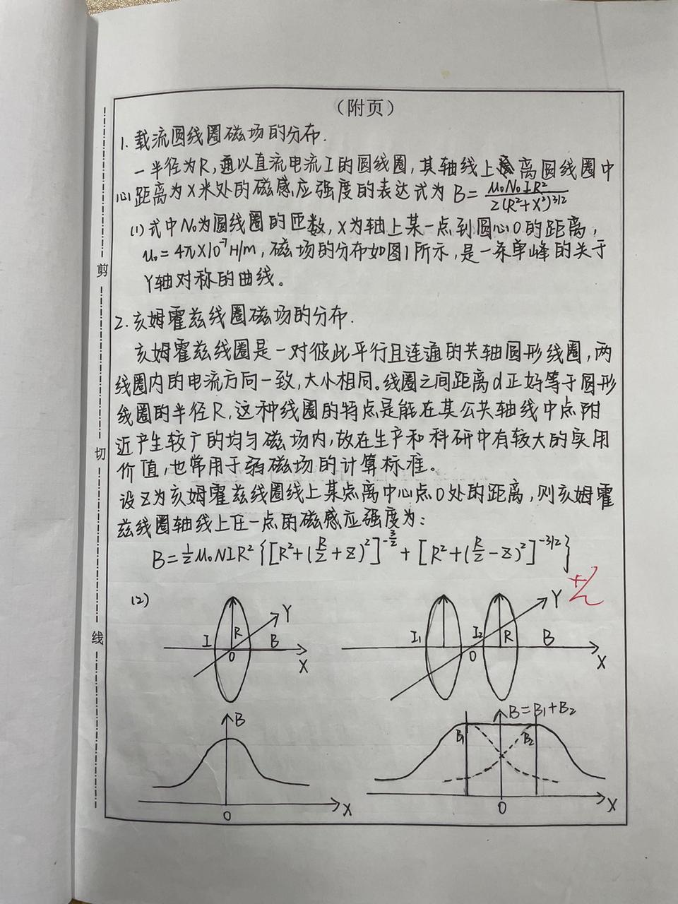 一半径为R,通以直流电流I的圆线圈,其轴线上离圆线圈中心距离为X米处的磁感应强度的表达式为: (1)