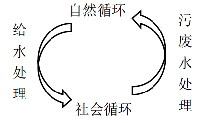 理想状态下,人类社会从水的自然循环中通过给水处理取用水资源,经过使用后被污染的水通过污废水处理再回到自然水体中去。