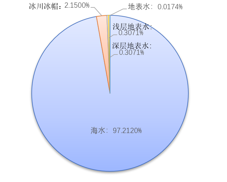 大部分的海水是不能被人类直接利用的,陆地上的淡水也有很多存在于两级冰川和山顶冰盖中,能够被人类直接利用的只有河水、淡水湖等地表水和部分浅层地下水,这部分的总量约占地球总水量的0.2%,体积约为3×106km³,由此可见人类可以直接利用的淡水资源是及其有限的。