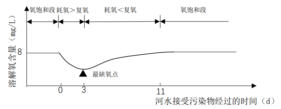 图中表示河流在接受污染物之后水中溶解氧含量随时间推移变化的曲线即为氧垂曲线。氧垂曲线能够反映了两点:1.间接表示了河流的自净过程;2.最缺氧点距离受污染点的位置及其溶解氧含量,可以对河流受污染情况进行预测和水体防护。