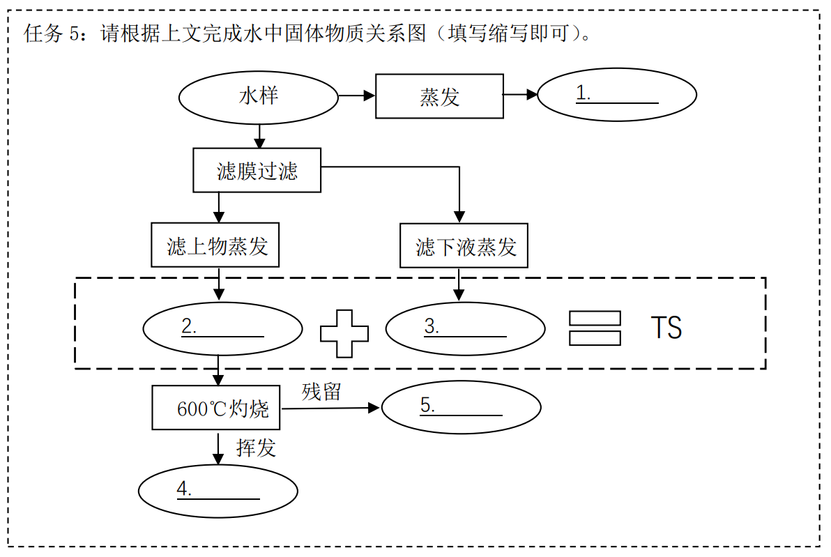 废水中所含的所有固体物质为总固体量(TS)。总固体量包括溶解性物质(DS)和悬浮固体物质(SS)。水样经过滤(0.45μm微孔滤膜)后,滤液蒸干所得的固体即为胶体和溶解固体(DS),滤渣脱水烘干后即为悬浮固体(SS)。悬浮固体根据挥发性可分为挥发性固体(VSS)和非挥发性固体(NVSS)两种,区分方法为将悬浮固体在600℃温度下灼烧,挥发掉的量即为挥发性固体也称灼减量,灼烧残渣则为非挥发性固体。这些指标之间的关系如下图所示,尝试根据上文表述,进行填空。
