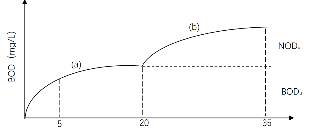 由于微生物分解消耗氧气的速度与温度有关,在一定范围内温度越高,微生物降解活性越强,消耗有机物的速度就越快,需氧越多。因此在实际测定BOD时将温度规定为20℃。由图中可知,一般15~20天第一阶段氧化完成,其需氧量表示为BOD20,可视其为完全生化需氧量BODu。但是在实际测定时,20天太长,一般采用5天作为测定时间(此时耗氧量为BODu的70%~80%),称为BOD5。因此把20℃、5天测定的BOD作为衡量废水可生化降解部分有机物浓度的指标。