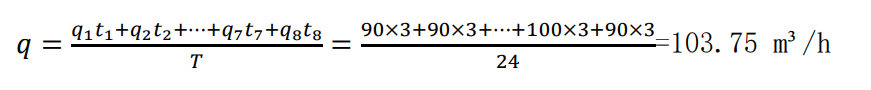 在一个生产周期T内,根据水量变化情况,可将一个周期分为若干个时段ti,则污水的平均流量q(m³/h)按下式计算,以例题2-1进行说明: