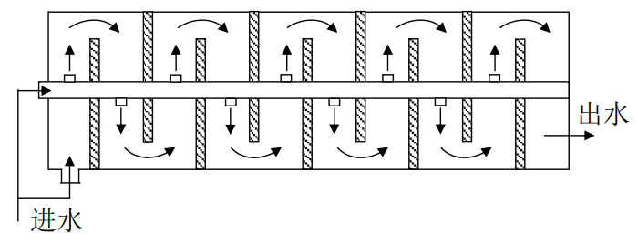 折流调节池在池内设置了很多折流隔墙,污水在池内来回折流,充分在池内得到混合,如图2-4所示。折流调节池配水槽设在调节池上,通过许多孔口流入,投配到调节池的前后各个位置,调节池的起端流量一般控制在1/3~1/4总流量,剩余的流量通过其他投配口等量投入池中。通过沿水流方向分阶段布水,实现了先进入和后进入污水的混合。