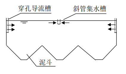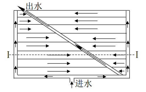 水流进入对角线调节池之后再隔板引流作用下由池子的两侧进入,在隔板间经过一段时间的流动和混合,通过穿孔导流槽进入由呈对角线设置的集水槽出水。呈对角线设置的集水槽将不同时间、不同浓度的污水进行混合,达到了均质的目的,如图2-2所示。