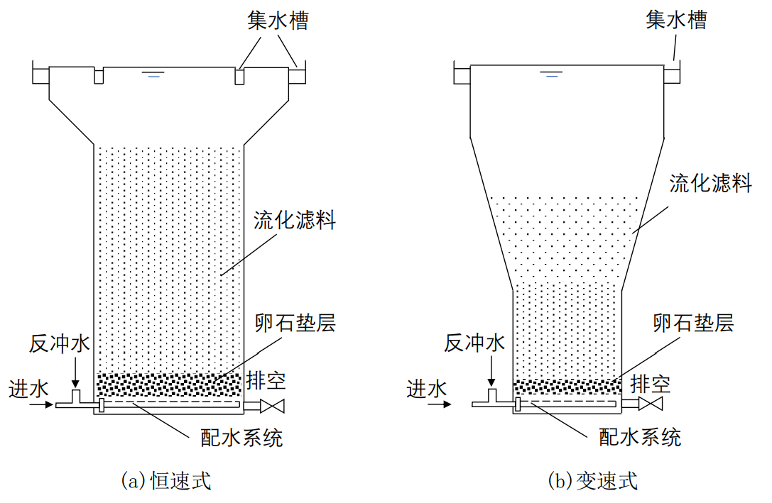 变速升流式膨胀滤池下部滤速高,可达130~150m/h远高于等速滤池,上部40~60m/h,从而解决了恒速膨胀滤池流化状态不佳和易携带滤料出水的问题。