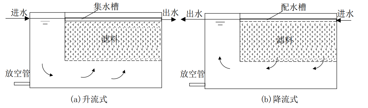 普通中和滤池为固定床即滤料固定不动,水的流向有平流式和竖流式两种。目前大多使用竖流式。根据水流上升或下降,竖流式也分为升流式和降流式两种,如图2-7所示。